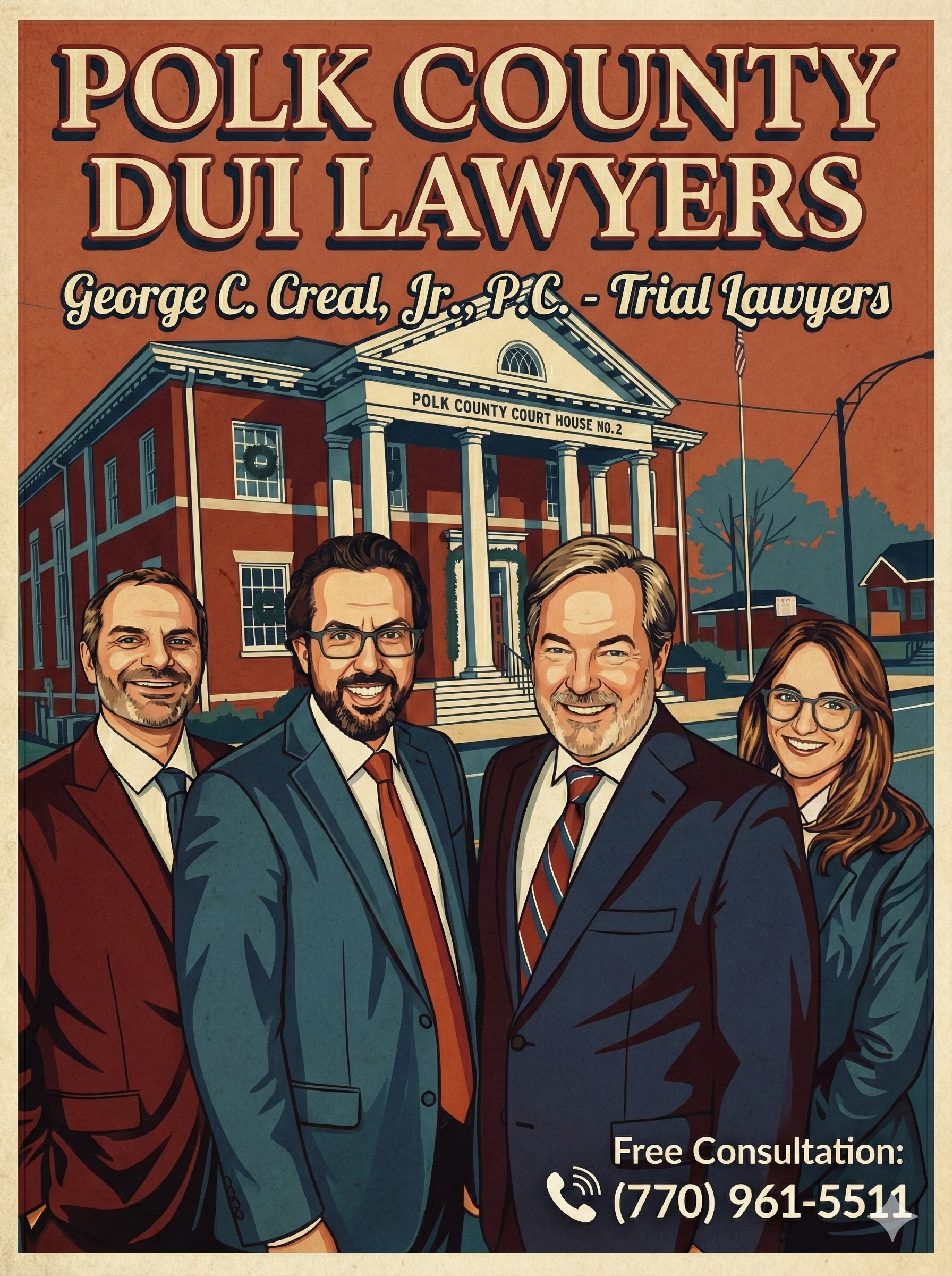 Arrested for DUI in Polk County Georgia? Need an accomplished, professional DUI attorney from the outside, George C. Creal, Jr., P.C. are the Real Deal DUI Attorneys. We are not afraid to aggressively defend your case in Polk County. We are outsiders, not a part of the system, our results are based on thorough investigations and mastery of Georgia DUI law. If you need a lawyer with the superior legal skill and not an insider looking to make a deal in order not to make the Prosecutor mad, we are the firm for you. Because our offices are in Atlanta, we are not cheap as we have to consider travel time. But if you have to have a Legal DUI expert on your team to win your case, we are ready for you.